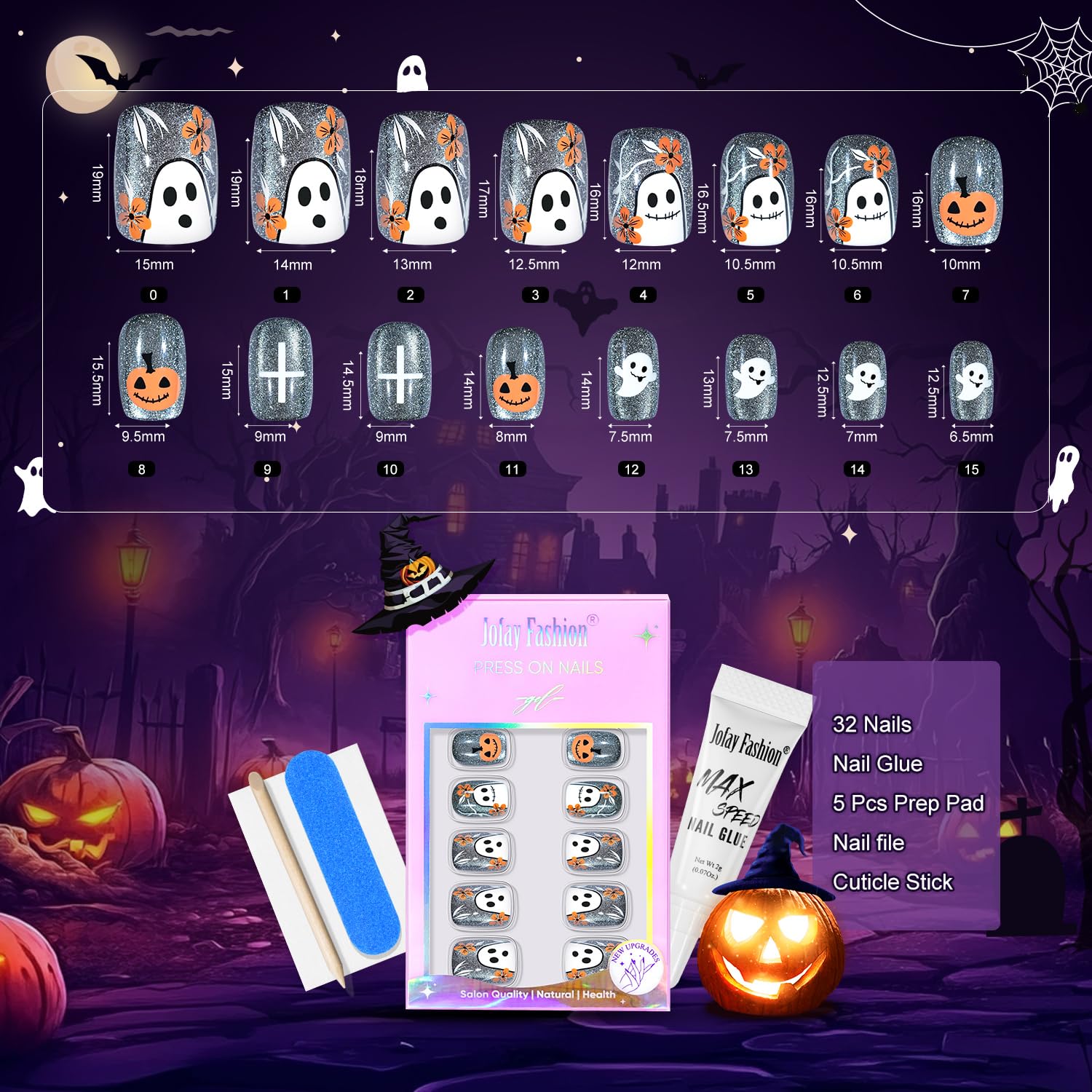 - What You Get: Each halloween nails press on art kit comes with 32 pcs short false nails with 16 sizes,1 nail glue,3 prep pads, 1 nail file, 1 wooden cuticle pusher