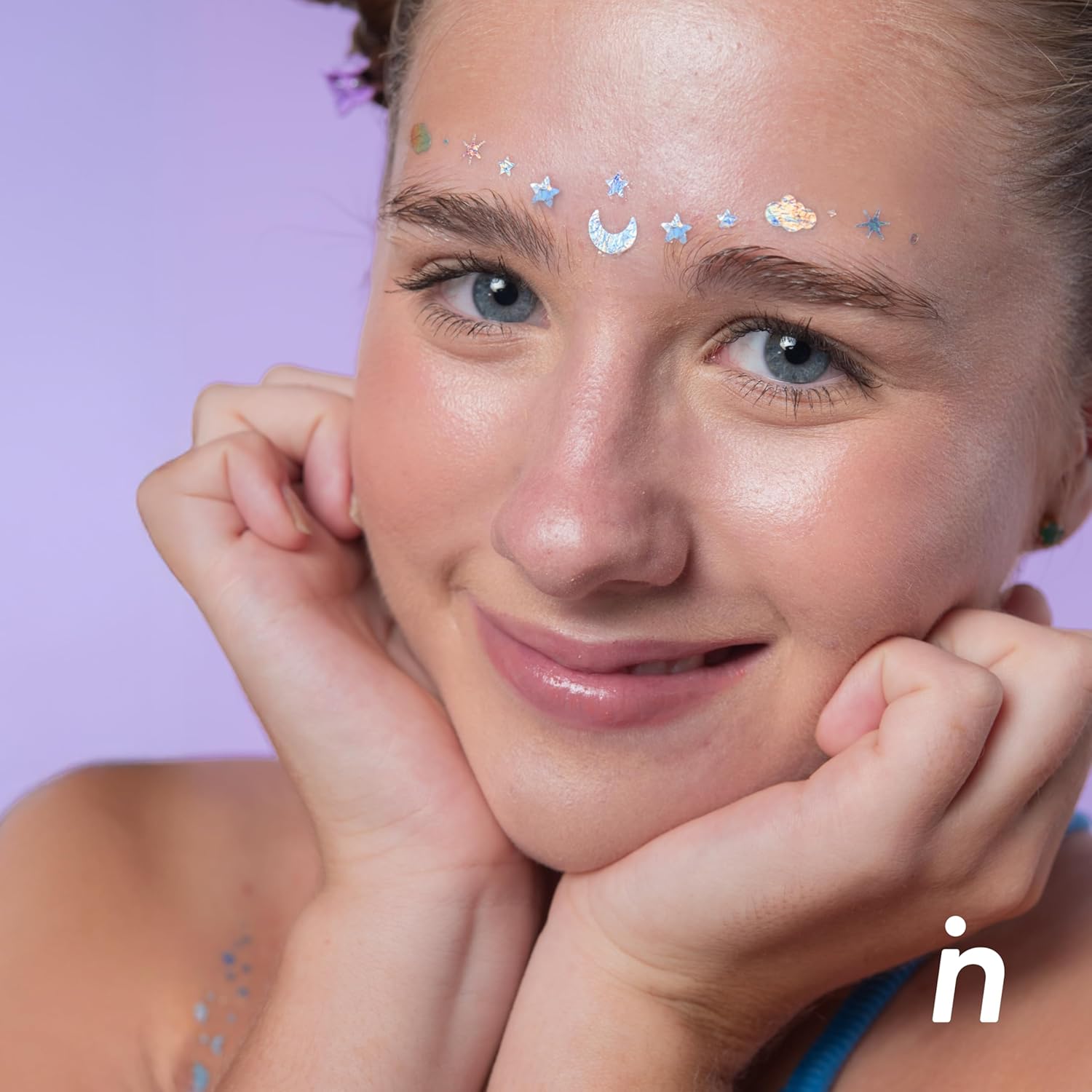 - GLOW LIKE THE GALAXY – Metallic moons, clouds & stars in dreamy sky-blue temporary face tattoos