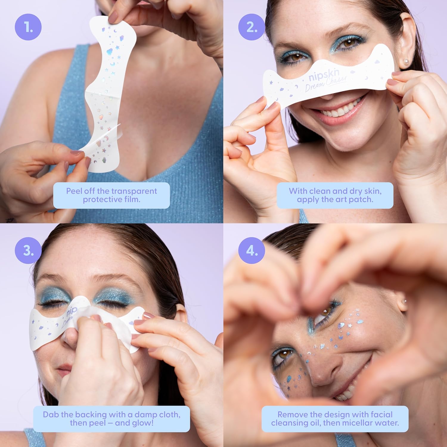 Nipskin Dream Chaser Stick-On Face & Body Art Patches – Metallic Sky Blue Moons, Clouds & Stars – Sweat-Proof, Soft on Skin – 4 Pieces