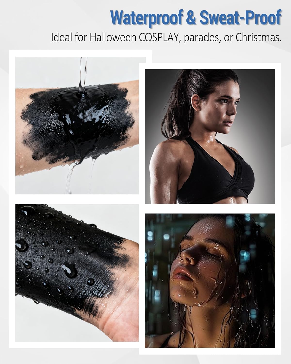 - Waterproof & Sweatproof – This black face paint stick has strong waterproof, sweatproof performance—rain or water won’t budge your makeup. No need to worry about your carefully designed look smudging or fading. TIP: This face paint is hard to dry—so if you’re applying it to areas like the body or spots that might get touched, we highly recommend sealing it in with some setting powder or spray.