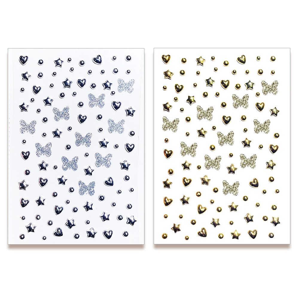 Fake Metallic Eye Corners Face Jewels Silver Gold Butterfly Face Gems Tattoo Decorations Body Glitter Crystal Sticker Temporary Tattoo, 2-Pack