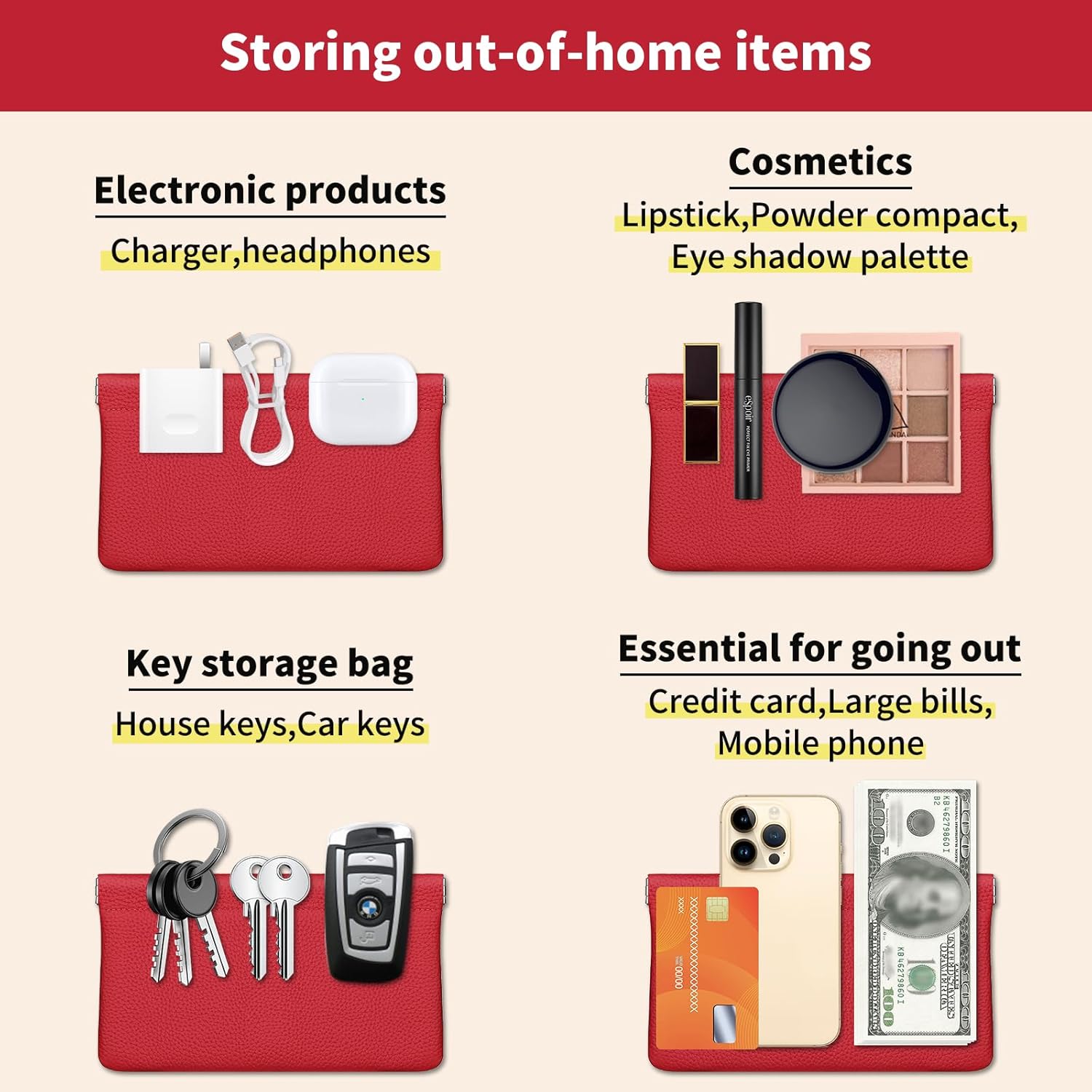 Genuine Leather Pocket Cosmetic Bag for Purse,Coin Purse Lipstick Cosmetic Accessories Travel Pouch for Storage Waterproof Portable No Zipper Self-closing Small Makeup Pouch (Red)