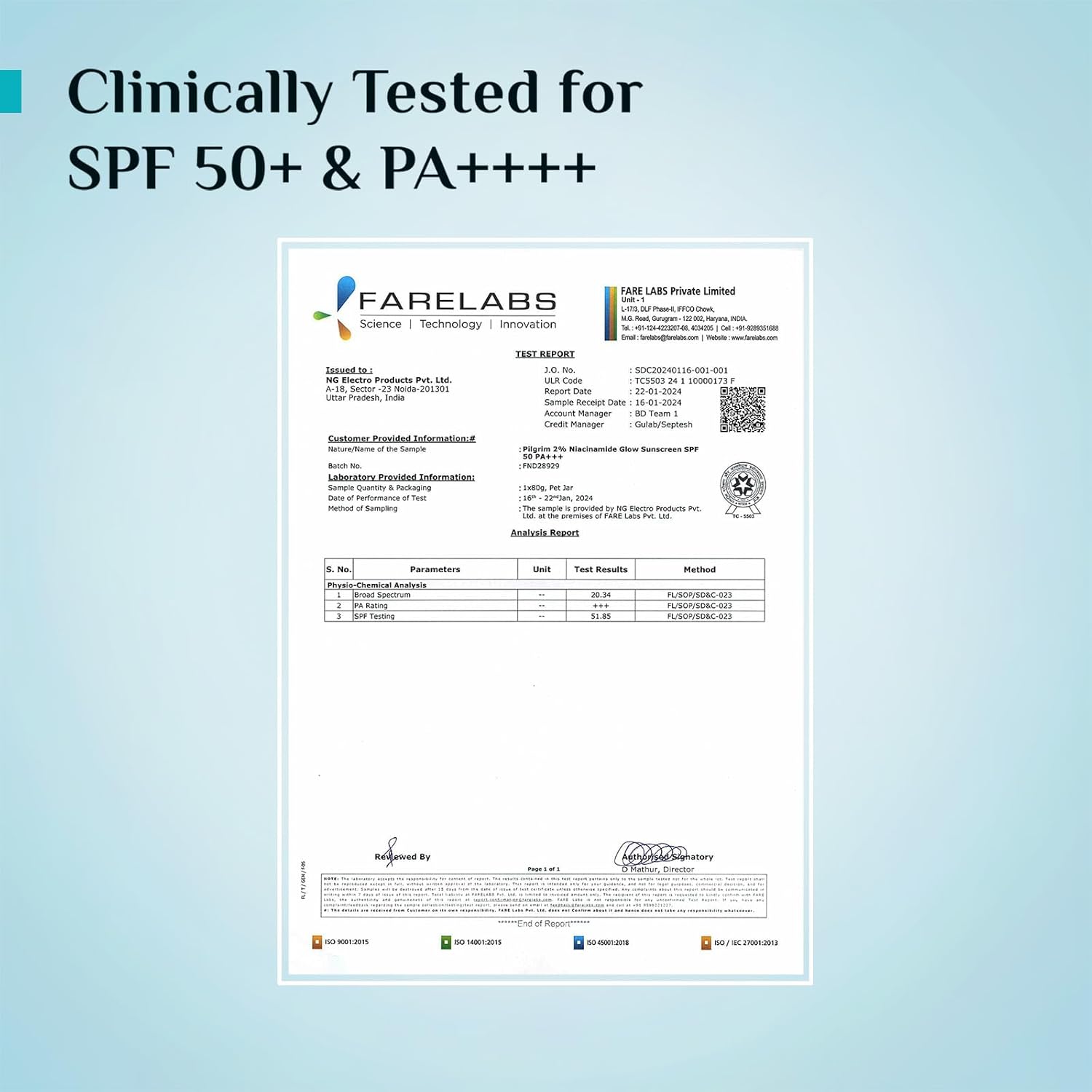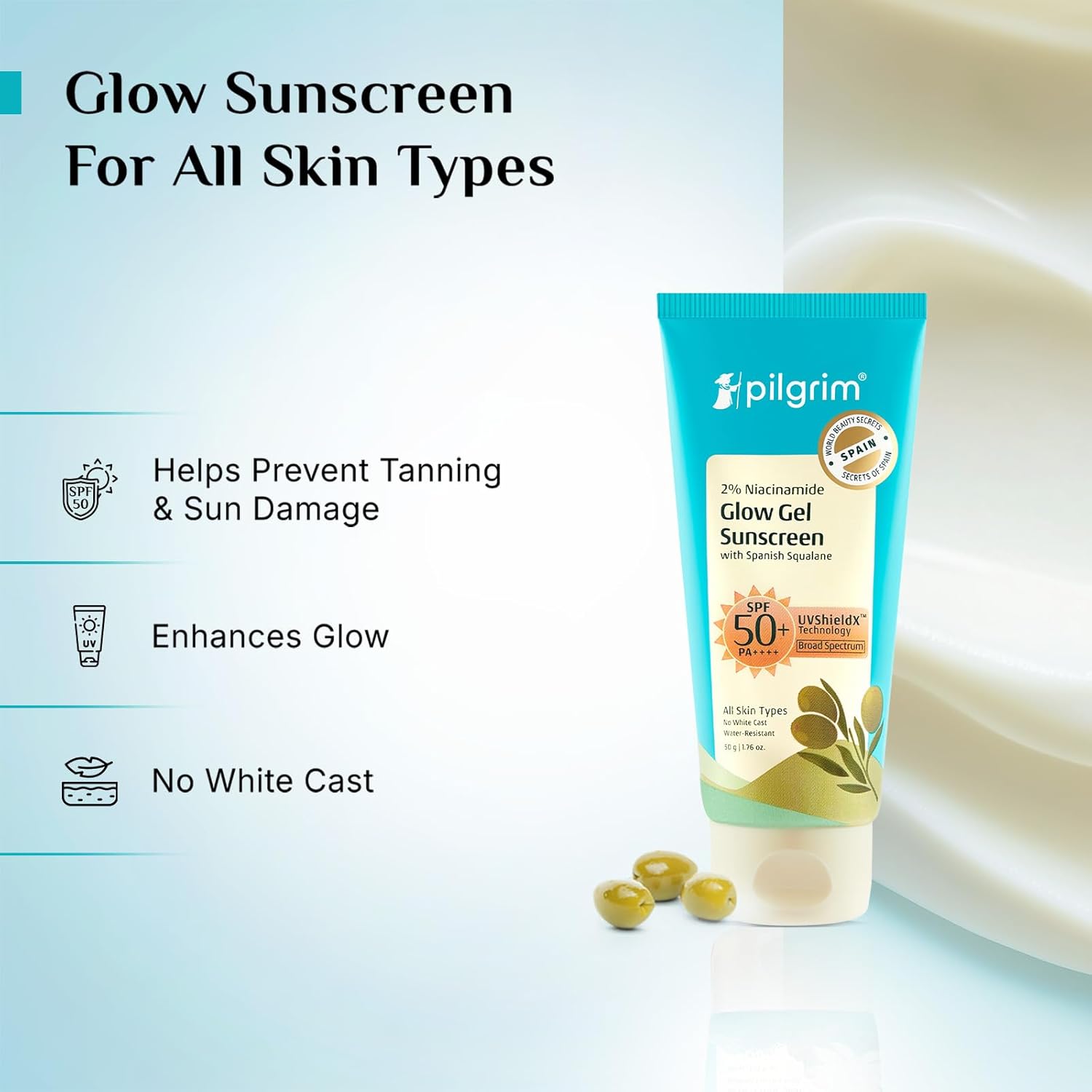 - Glow & Protect: The 2% Niacinamide Glow Sunscreen SPF 50+++ protects against UVA, UVB, and blue light while brightening skin and preventing tanning.