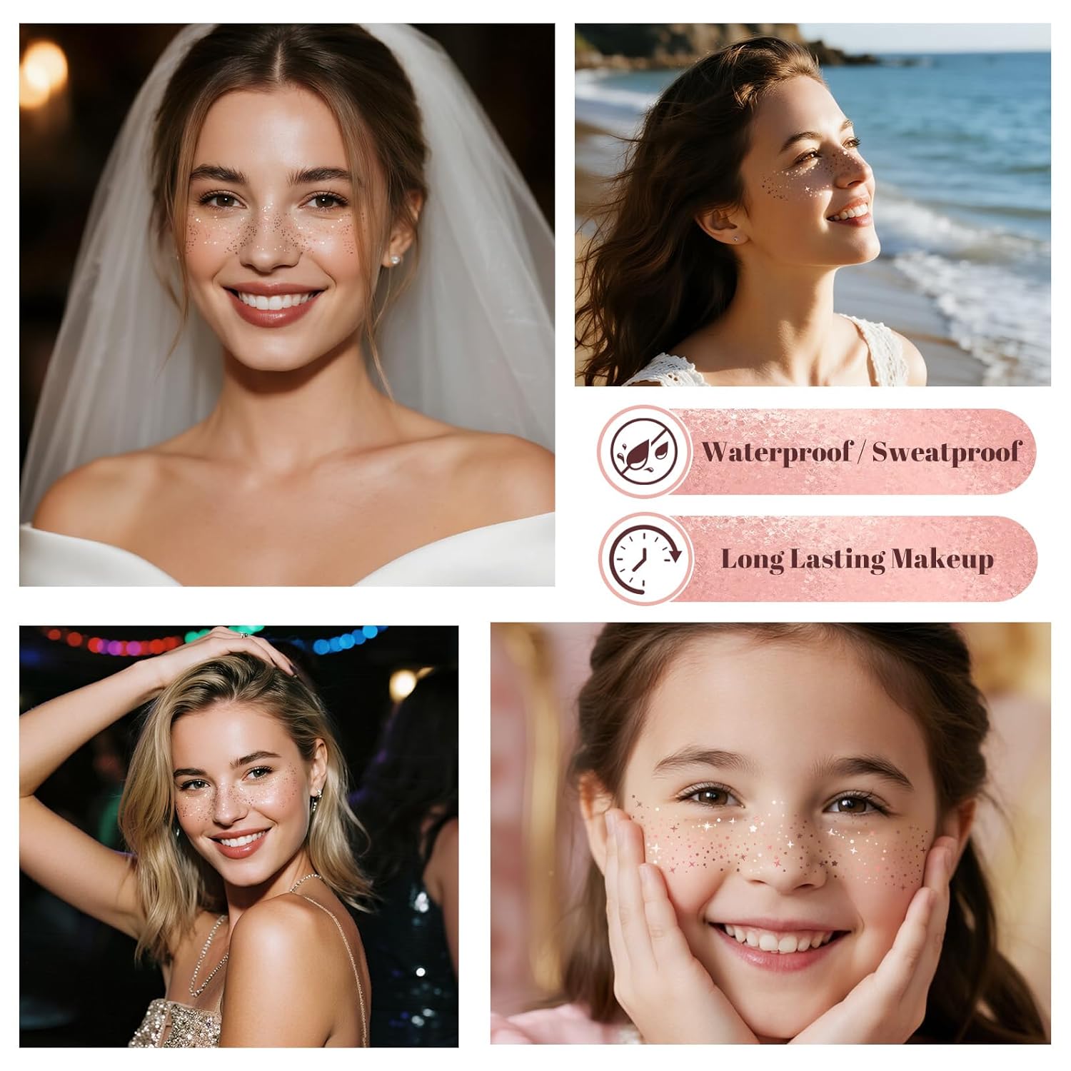 - 【Waterproof and Long-lasting Effect】: This face glitter freckles redefines beauty with its waterproof and sweat-proof function. Whether you are working out in the gym, pool parties, festivals, or rainy-day adventures, our sparkle freckles can stay flawlessly in place with vibrant color that lasts all day.
