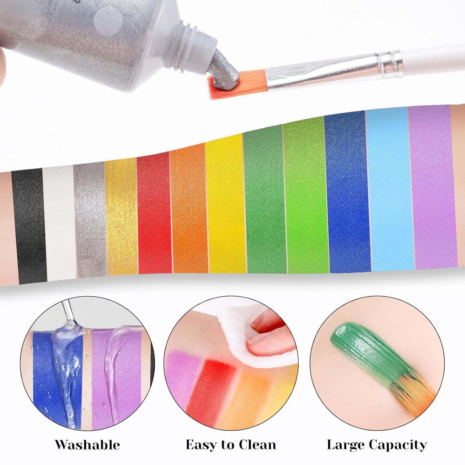 - [Gentle Water-Based Body Paint] Our skin-friendly water-based face paint ensures comfort and safety. It blends and applies easily with brushes or sponges, dries without cracking, and removes effortlessly with mild soap and water. Suitable even for sensitive skin, it’s perfect for long-term wear at Costume Events, theater performances, or lively Halloween cosplay makeup parties.