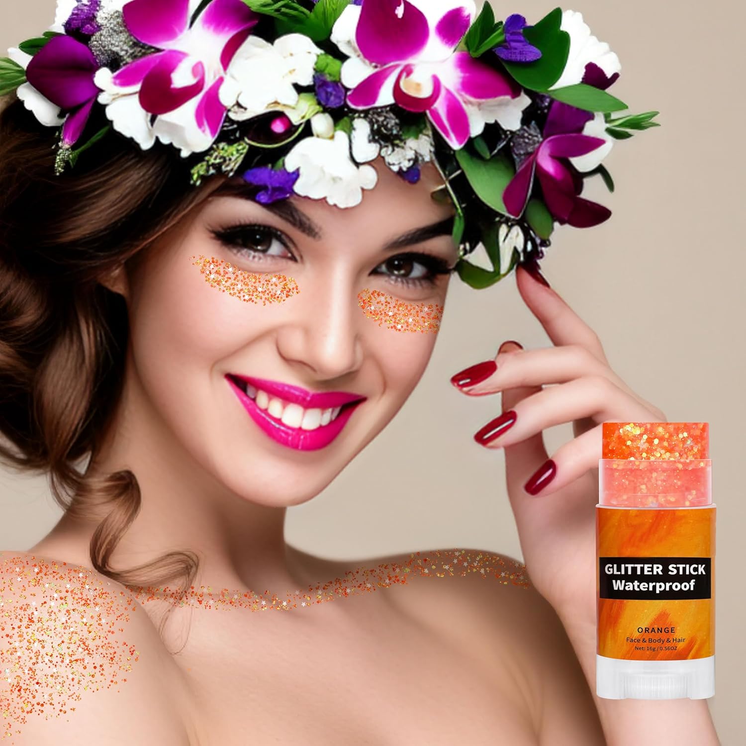 - EASY TO USE AND REMOVE: Orange face glitter stick is designed for effortless application. Just swipe it on for an instant sparkle. When it's time to clean up, the glitter easily washes off with remover cream leaving no residue behind