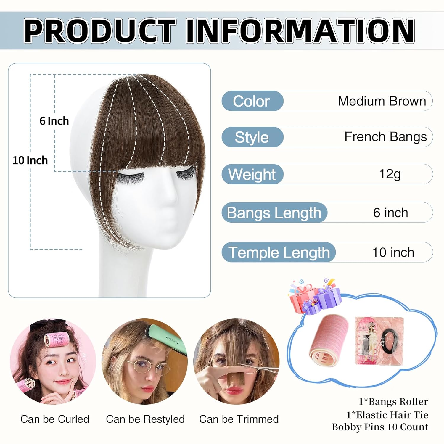 Clip In Bangs for Women, Medium Brown French Bangs Hair Clip with Temples, 100% Real Human Hair Layered Curved Fringe for Halloween and Daily Use(Medium Brown, French Bangs)
