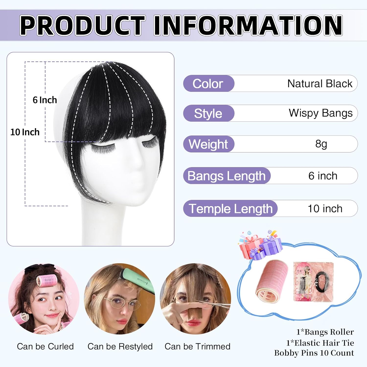 Wispy Bangs Hair Clip, 100% Human Hair Clip In Natural Black Bangs for Women, Soft Layered Fake Bangs with Feathered Fringe, Easy Clip-On Design for Daily Wear & Halloween