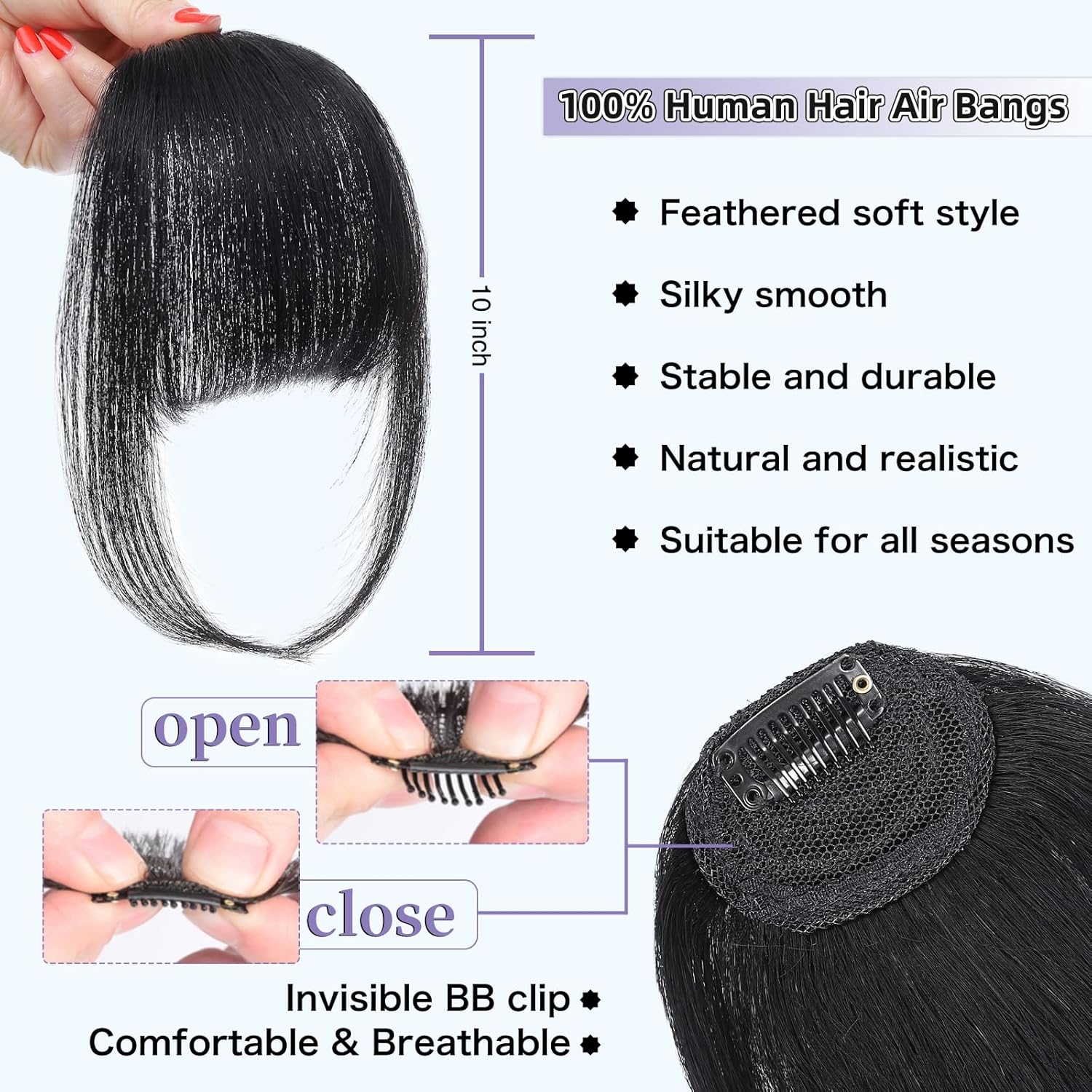 - 100% Real Human Hair Clip In Bangs:Crafted from premium 100% real human hair, these clip on bangs are exceptionally soft, shiny, and versatile. They blend seamlessly with your natural hair, allowing you to curl, straighten, or even dye them to match your desired style. Perfect for creating a natural, undetectable look in seconds.