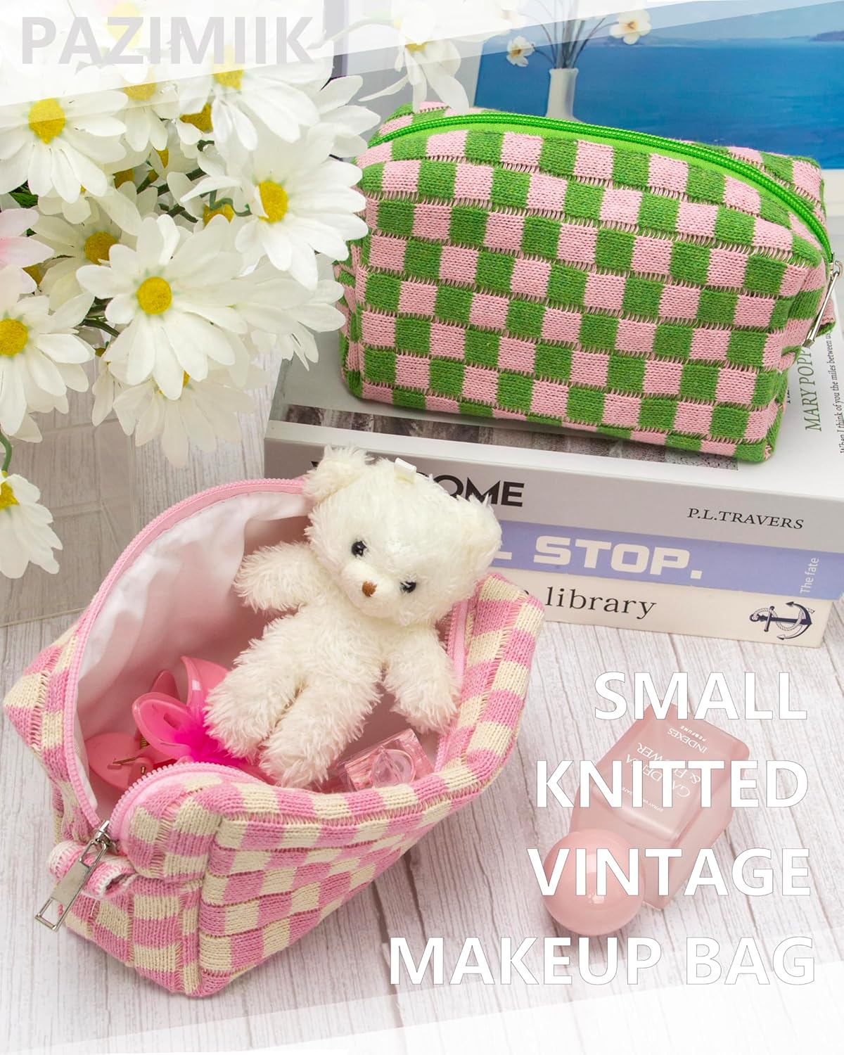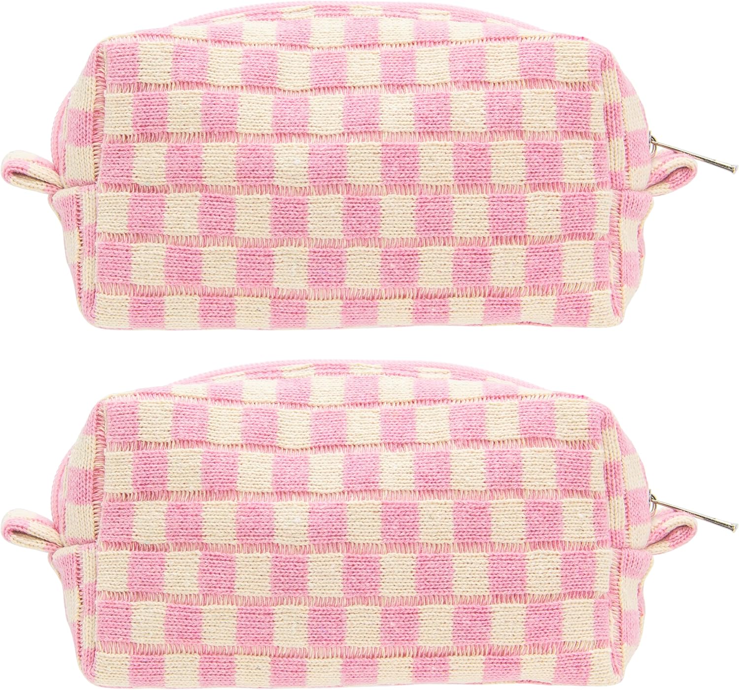 PAZIMIIK 2PCS Checkered Makeup Bag for Purse Portable Zipper Make Up Pouch Small Cosmetic Case for Travel Accessories Pink Beige