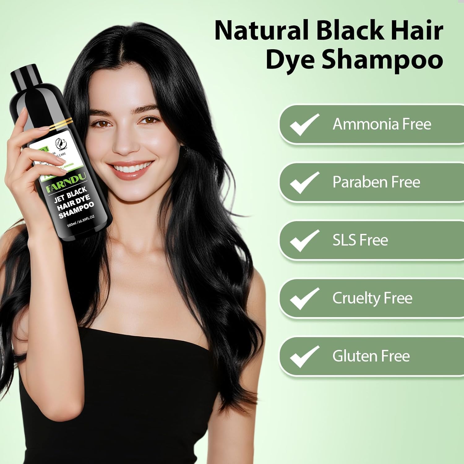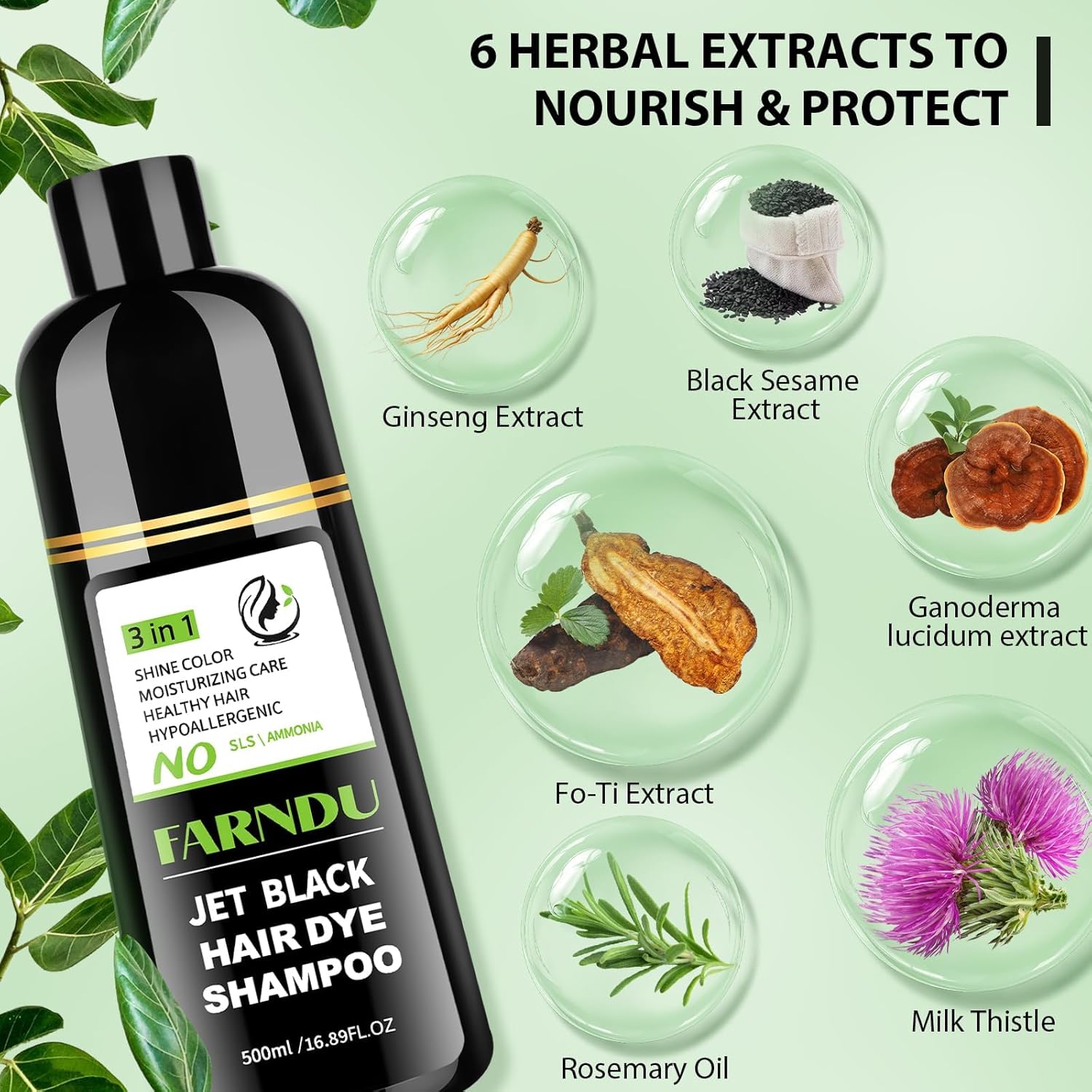 FARNDU Jet Black Hair Dye Shampoo for Women & Men, 3 in 1 Natural Herbal Color Shampoo for 100% Gray Coverage, Ammonia & Paraben Free (500ml)