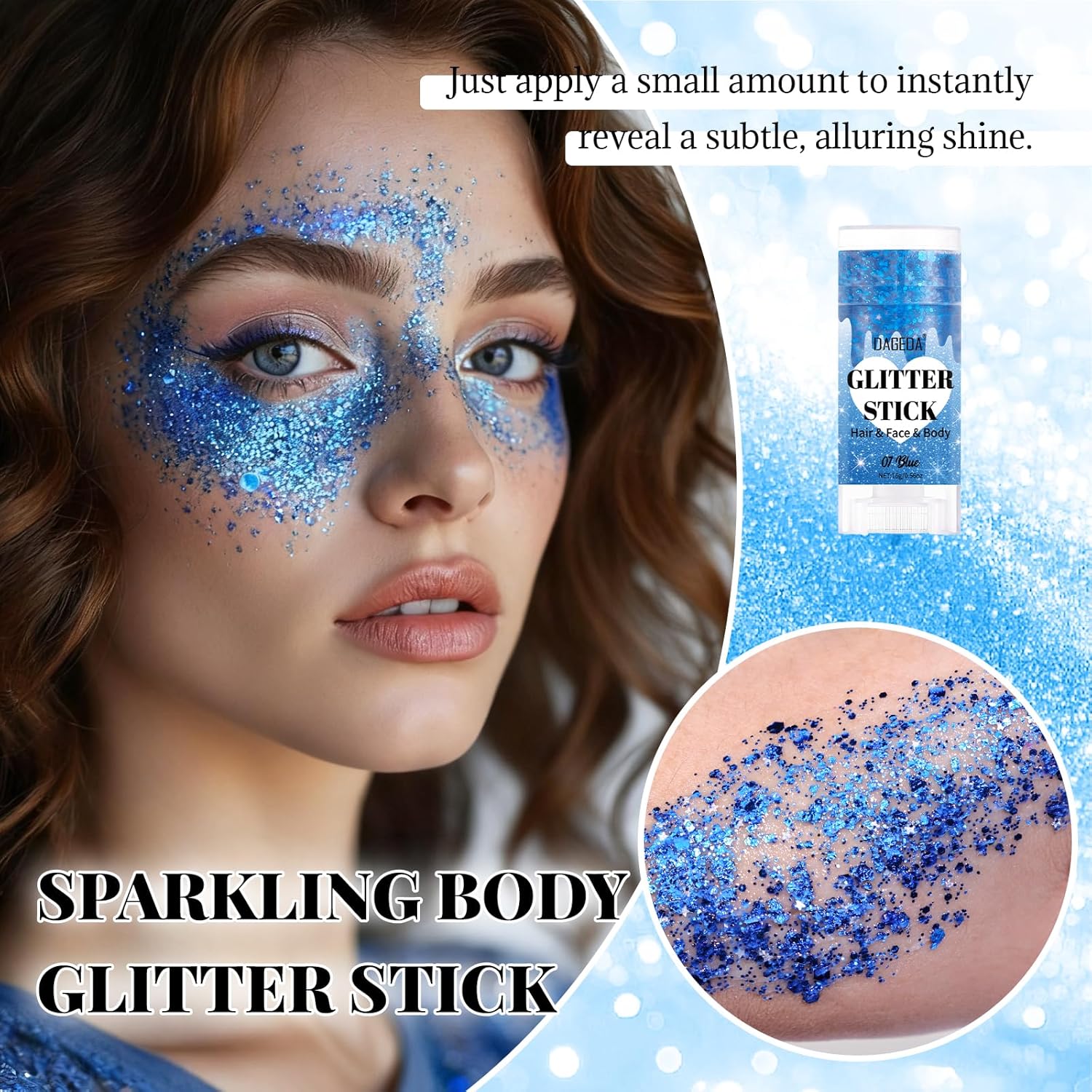 - Sparkly Glitter Makeup:DAGEDA blue face glitter stick is packed with rich chunky glitter particles and dotted with star-shaped glitter flakes that sparkle uniquely in the light. Just apply a small amount to instantly reveal a subtle, charming glow, making your rave party night even more dazzling.It is a blue glitter makeup suitable for women and girls.