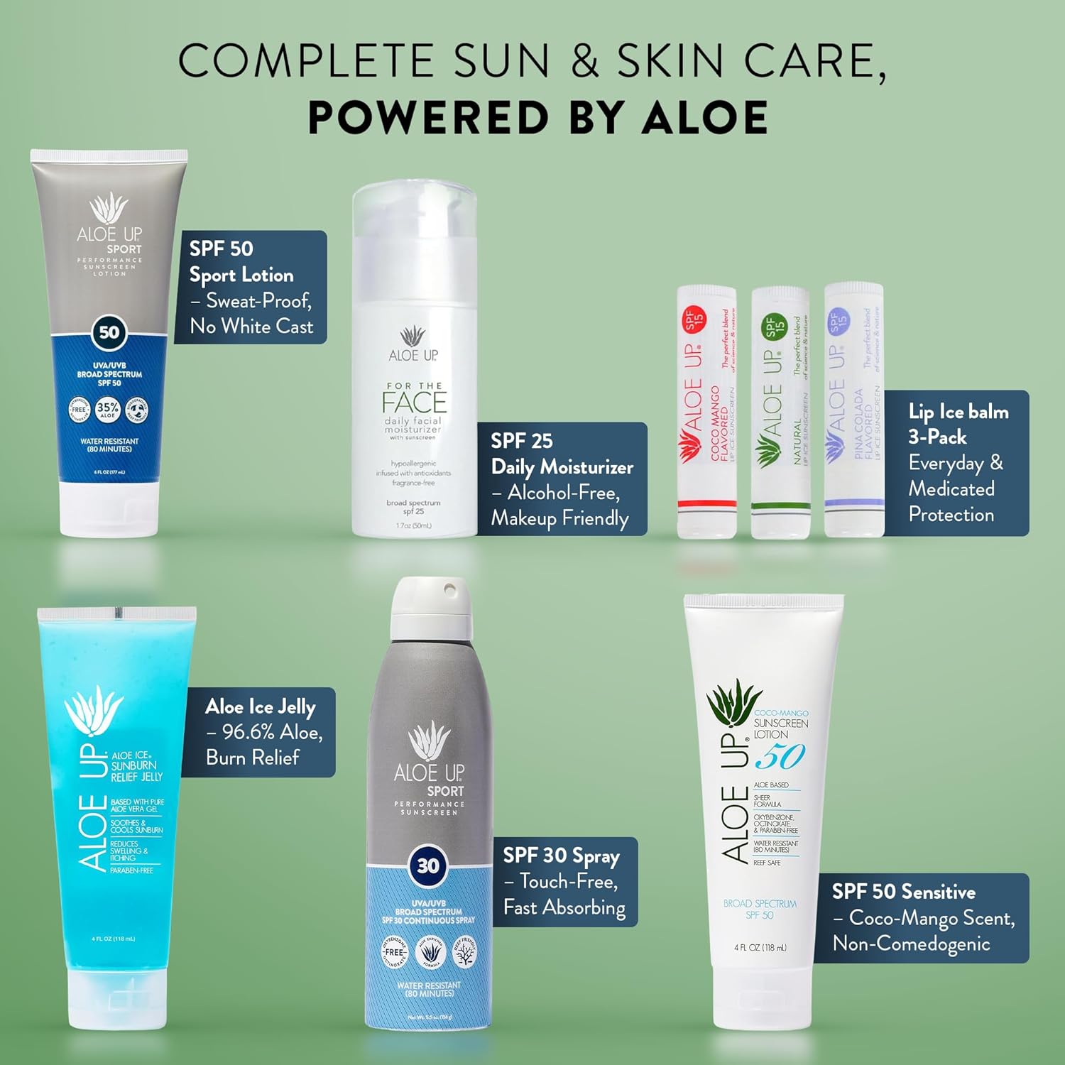 - Complete Skin Wellness in One Giftable Set Includes 6-Piece Aloe-Based Skincare product – Face Daily Moisturizer, Sport SPF 50 lotion 6oz, Sport SPF 30 Spray, White Collection SPF 50 Lotion, Aloe ice Jelly 4oz, and a 3-pack of Lip Ice balms—Natural Lip balm, Pina Colada flavored lip balm, Coco Mango Flavored Lip Balm.