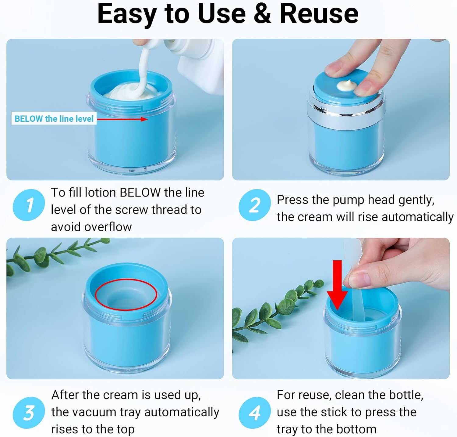 - Innovative Airless Pump Mechanism: Leveraging advanced vacuum technology, our airless pump bottles can protect cosmetics against exposure to air, prolonging the product's freshness. To fill lotion BELOW the line level of the screw thread to avoid overflow