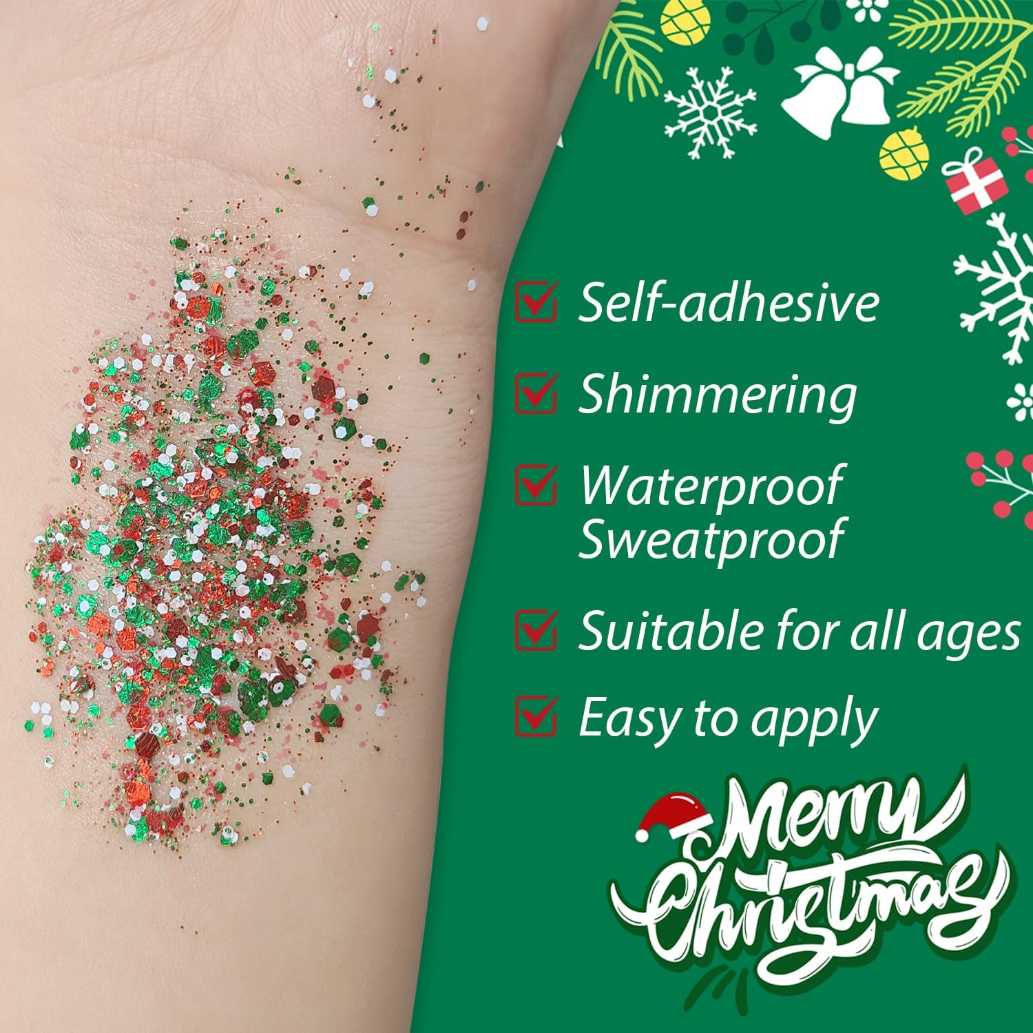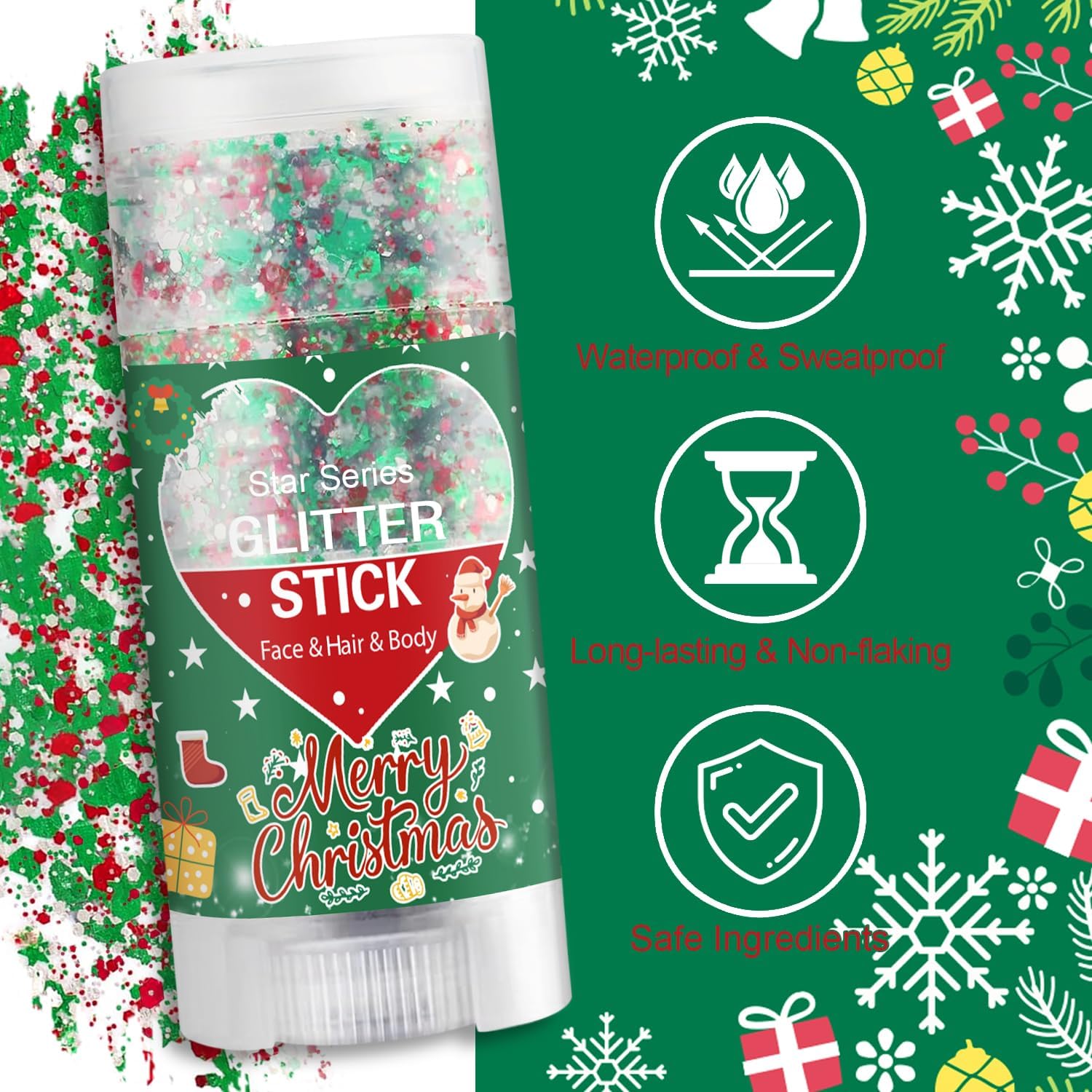 - 【Christmas Glitter Gel Stick for Body, Face & Hair】Our mesmerizing glitter gel stick infused with Green Red White holographic glitters & iridescent shimmer, it creates a dazzling, color-shifting spectacle that dances with light from every angle.Achieve super-vibrant, high-impact sparkle on your body, face, or hair – perfect for creating show-stopping glitter makeup or dazzling hair accessories.