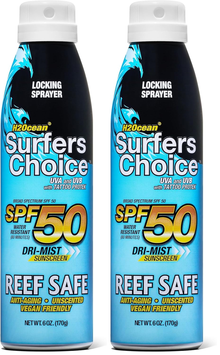 H2Ocean Surfers Choice SPF 50 Spray - Quick-Drying Sunscreen Spray for Tattoo Aftercare & UV Protection - Reef-Safe Sun Protection for All Ages - 6 oz (Pack of 2)