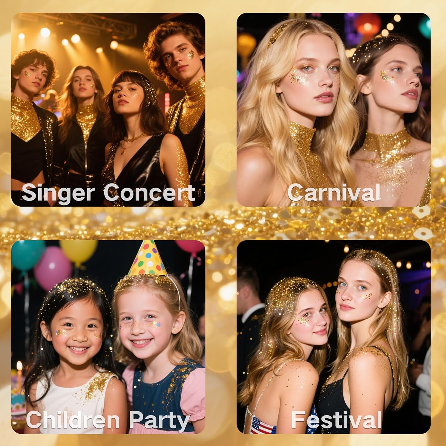- VERSATILE FOR ANY OCCASION :Perfect for face, hair, and body, this gold glitter gel is great for festivals, parties, cosplay, raves, performances, and more.Whether you want a subtle glow or a bold, sparkling effect, it's your must-have for creative makeup looks