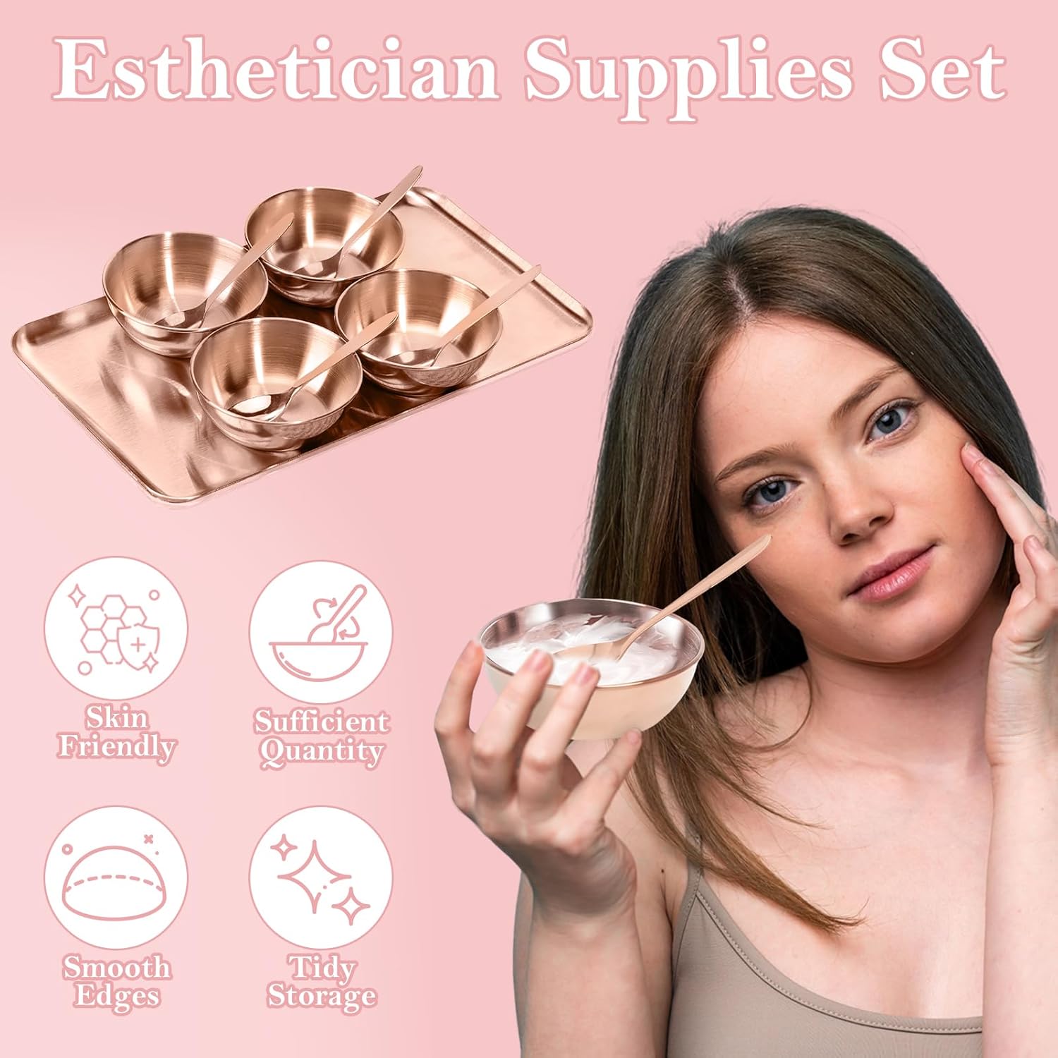 - 1.Rose Gold Esthetician Supplies:Elegant and functional, this rose gold esthetician set blends chic aesthetics with practicality, this rose gold esthetician set comes with 4 PCS 3.35X1.2 inch stainless steel DIY face mask mixing bowls, 4 PCS 3.9x0.8 inch facial mixing spoons, and a 10.4x6.1 inch large metal spa tray. Rose gold esthetician set is perfect for at home or salon facial care, ensuring you always have a mixing bowl ready for your skincare routine,ensures you always have a ready to use mixing bowl, making your facial prep enjoyable.