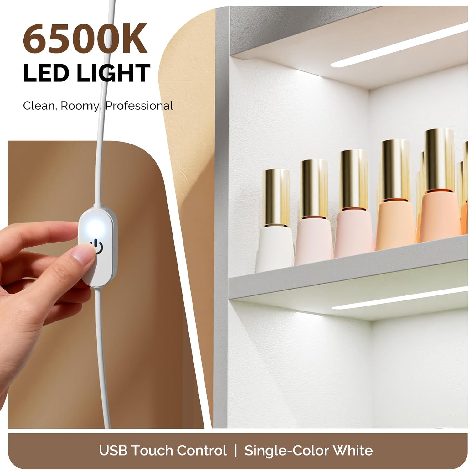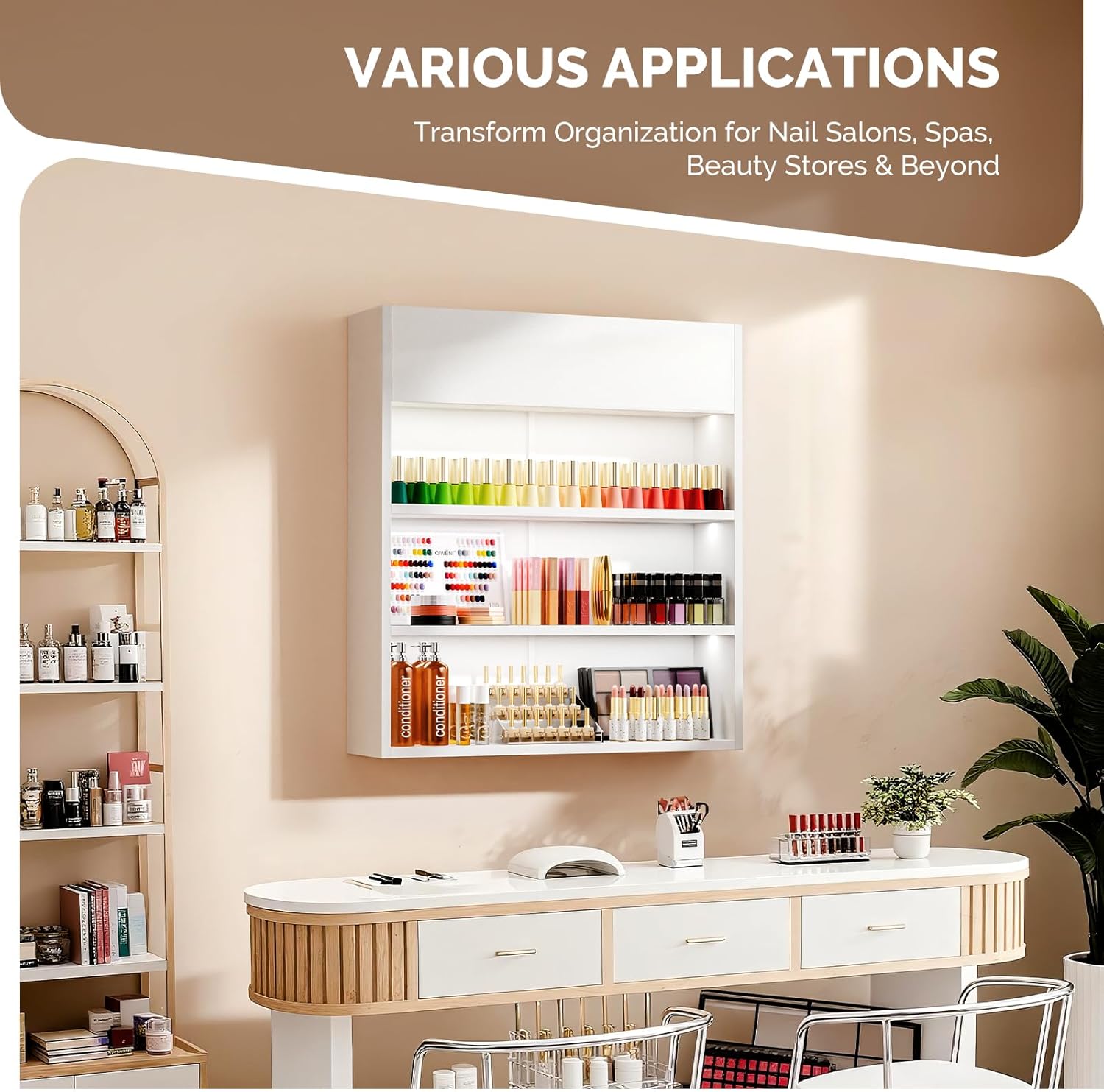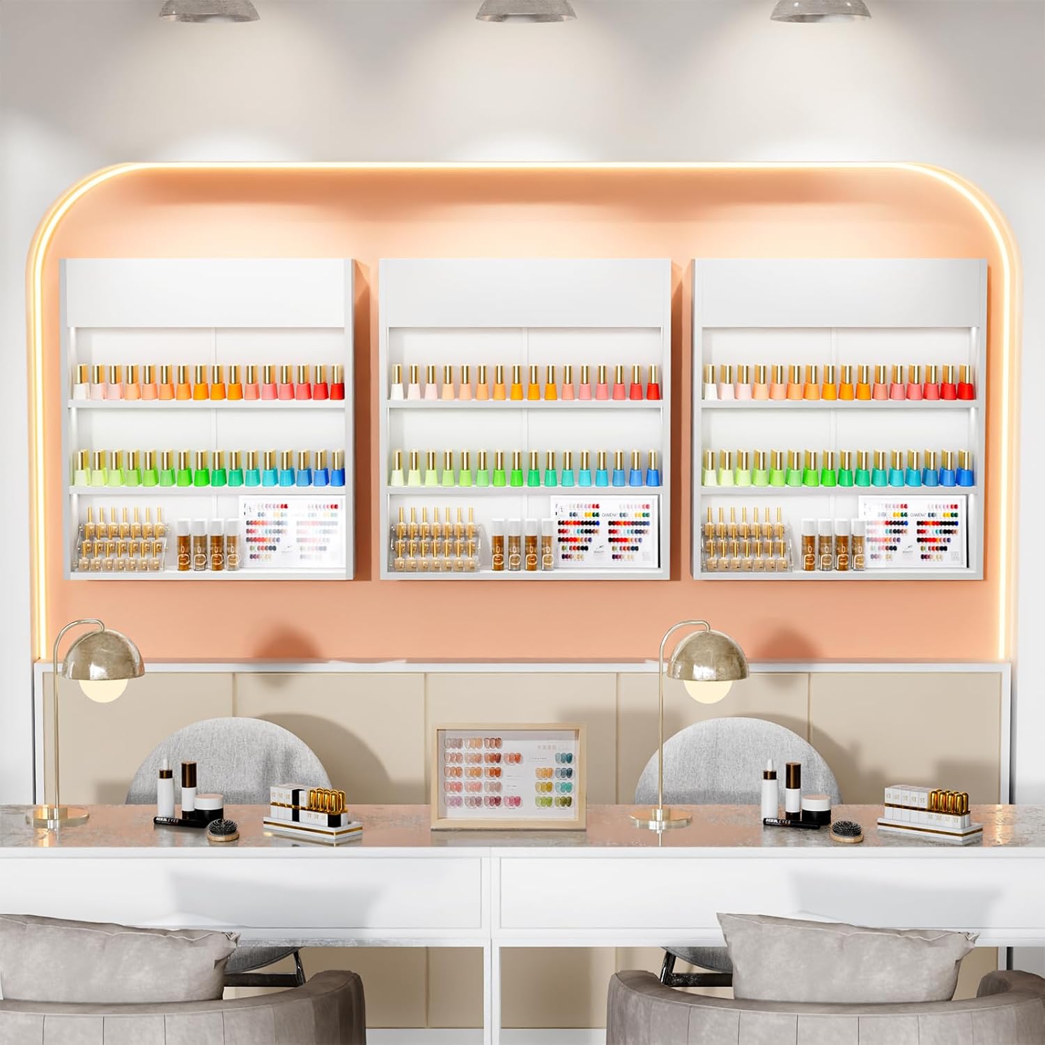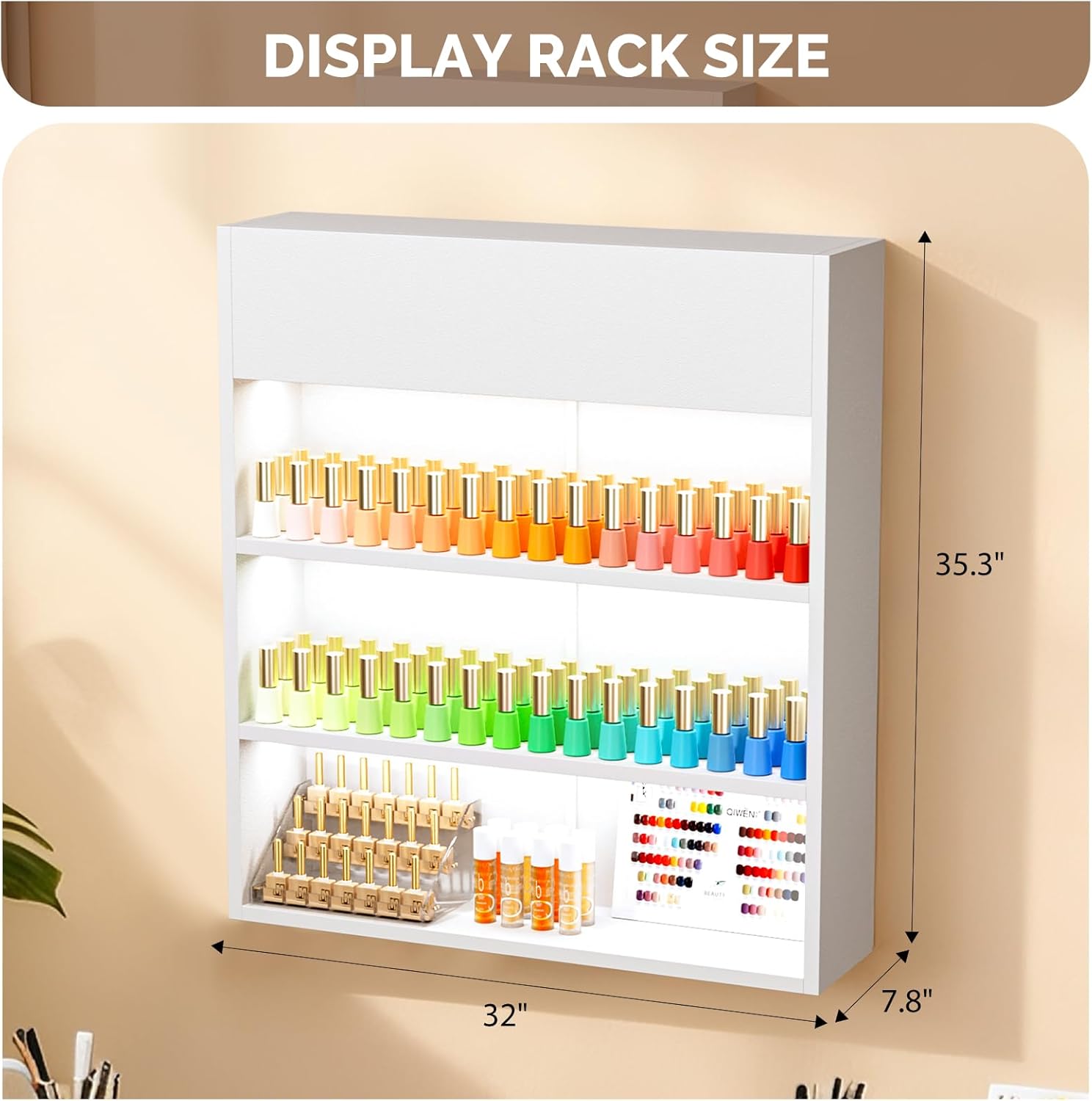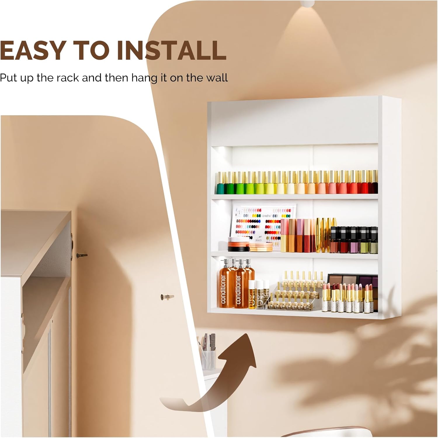 OmySalon Wall Mounted Display Rack, 32-Inch 3-Tier LED Nail Polish Organizer Shelf with USB Touch Control, for Nail Salon, Spa, Beauty Studio Storage, Wooden Retail Display (White)