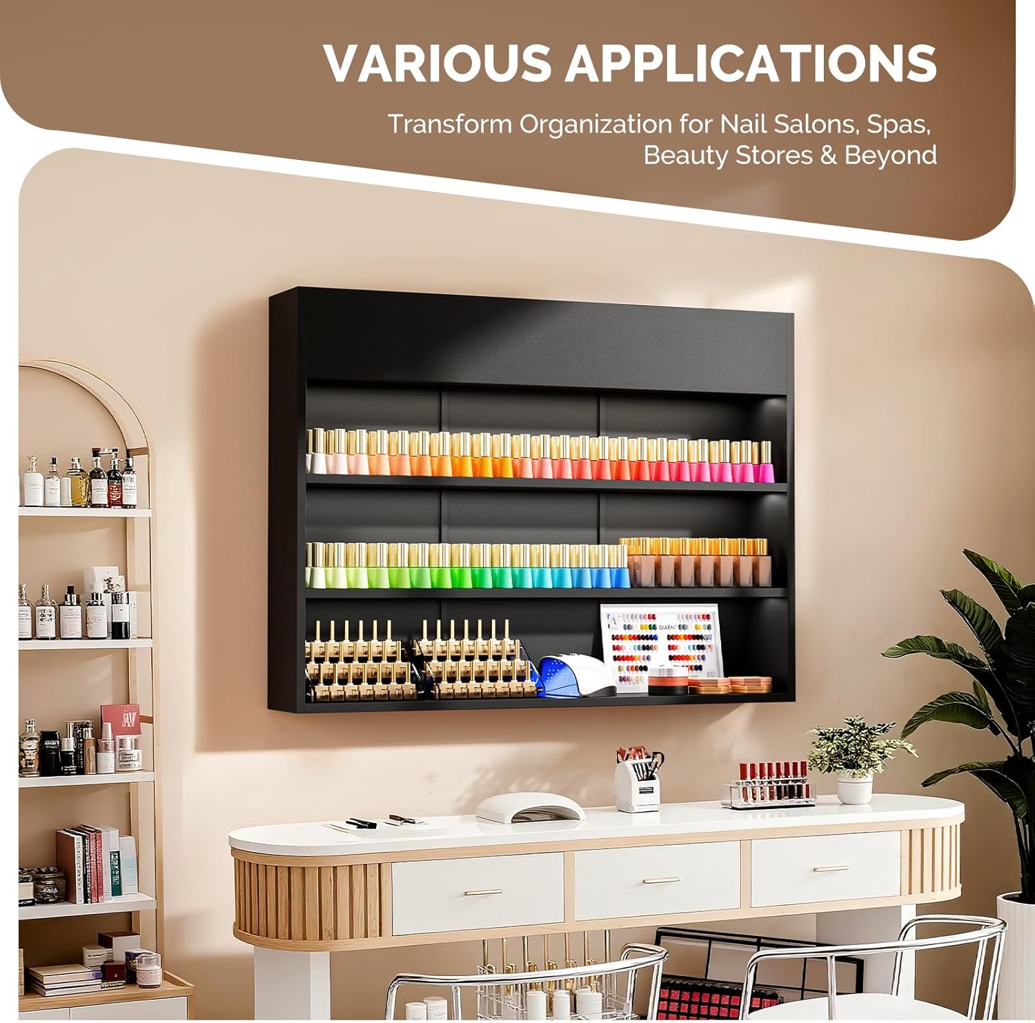 - 🏠 Space-Saving Wall Mounted Design: This wall-mounted organizer effectively frees up valuable floor and counter space, making it ideal for optimizing layout in compact nail studio stations, spa treatment rooms, or retail shop counters. Overall dimensions: 47.6" L × 7.8" D × 35.3" H.