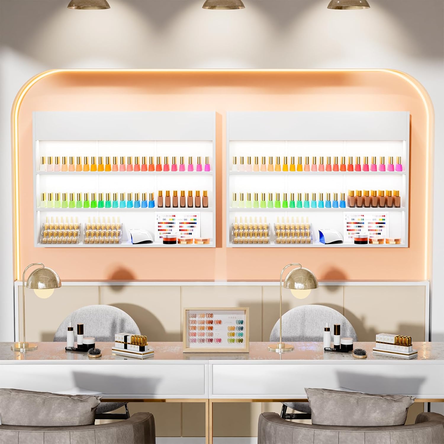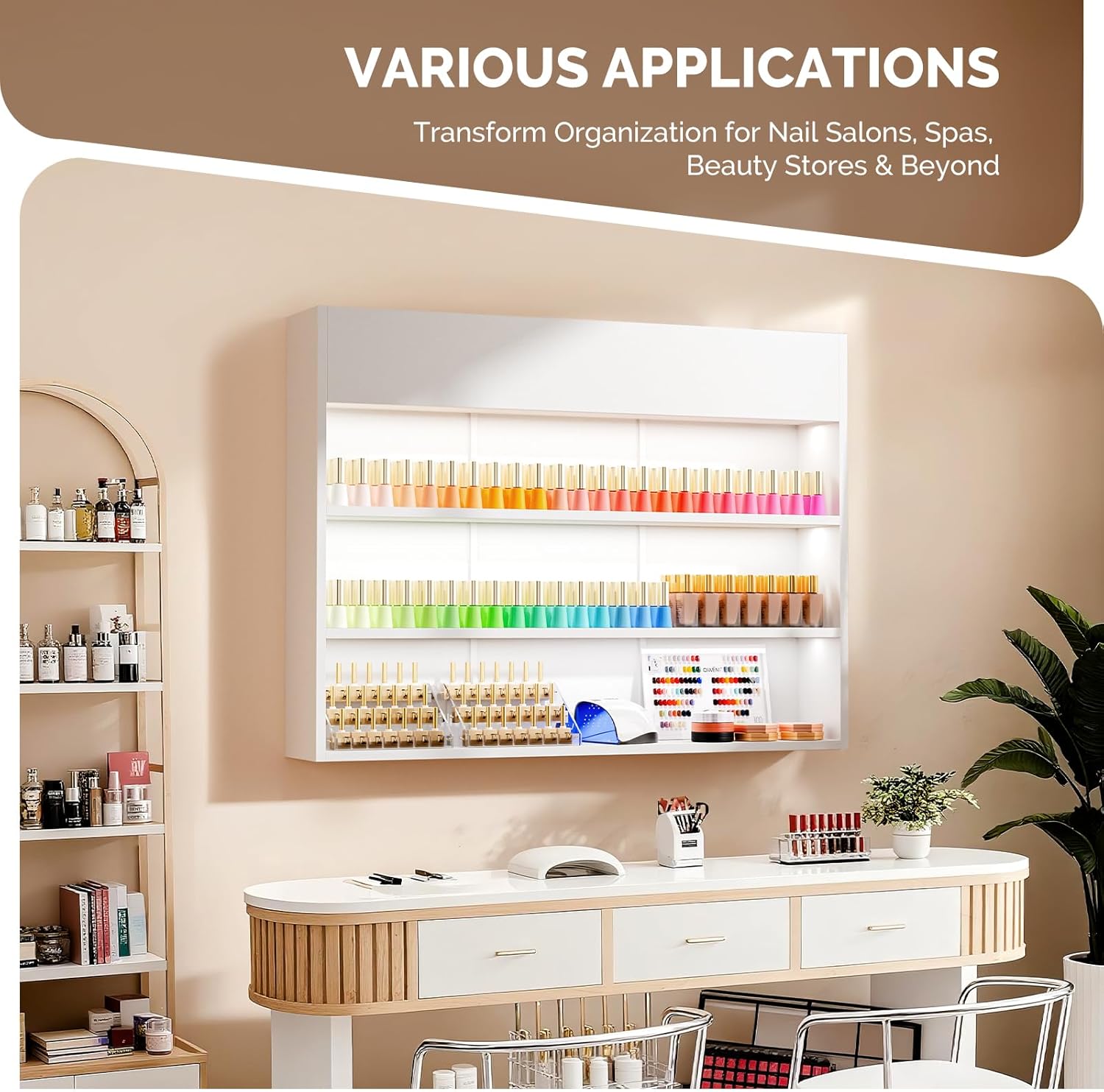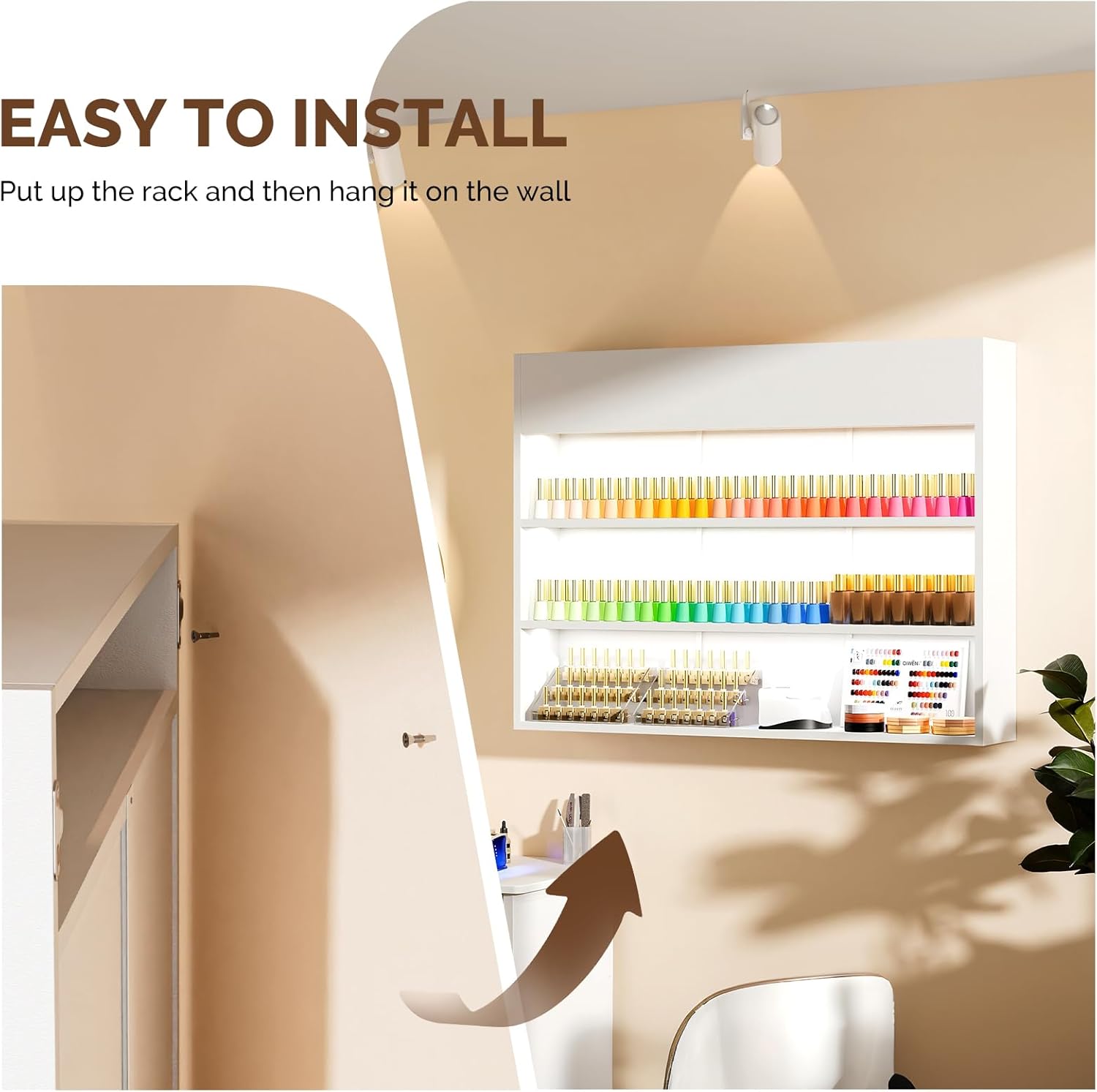 OmySalon Wall Mounted Display Rack, 47.6-Inch 3-Tier LED Nail Polish Organizer Shelf with USB Touch Control, for Nail Salon, Spa, Beauty Studio Storage, Wooden Retail Display (White)